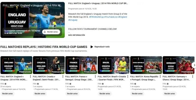 随着2026年将在美国、墨西哥和加拿大举办的史上最大规模世界杯的临近,国际足联准备了一项预热活动:通过其YouTube频道播放历届世界杯中一些最经典的赛事,总共将播出40场比赛。